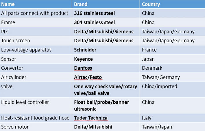 3. Všechny komponenty, které přicházejí do styku s výrobkem, jsou vyrobeny z 316 L nerezové oceli dovážené a zpracované na CNC strojích.